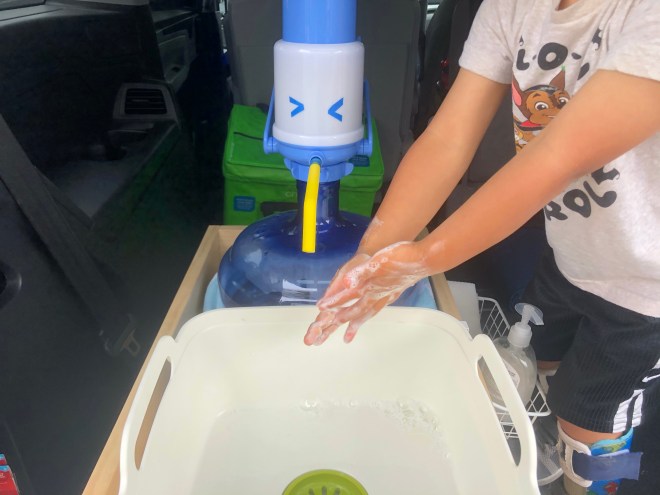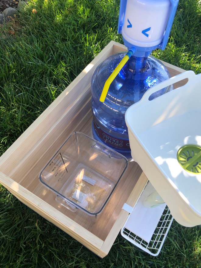 I searched online for some DIY portable hand washing stations and while many were great, I couldn’t find any examples where you 1) could keep it in the car without it falling over during driving; 2) would not need to use any batteries/electricity; 3) could store the dirty water in a container for later disposal (cuz not every place you’d use the sink would be keen on you dumping the used soapy water there); and a bonus feature 4) It was made of parts that had dual purposes so when we didn’t need the hand washing station, we could still use its parts for other things.