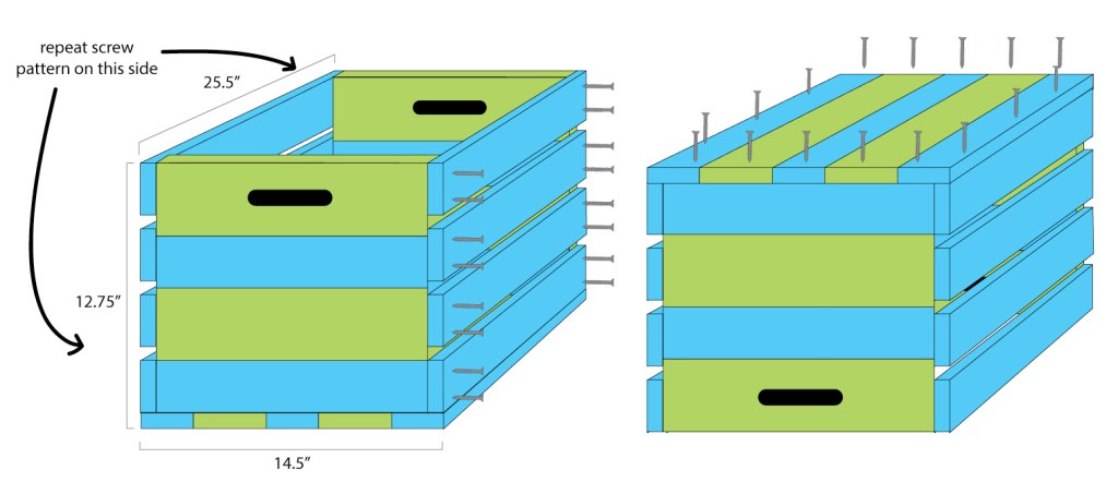 4. Assemble your crate by gluing and screwing the side slats to the sides with the handles and also to the base.