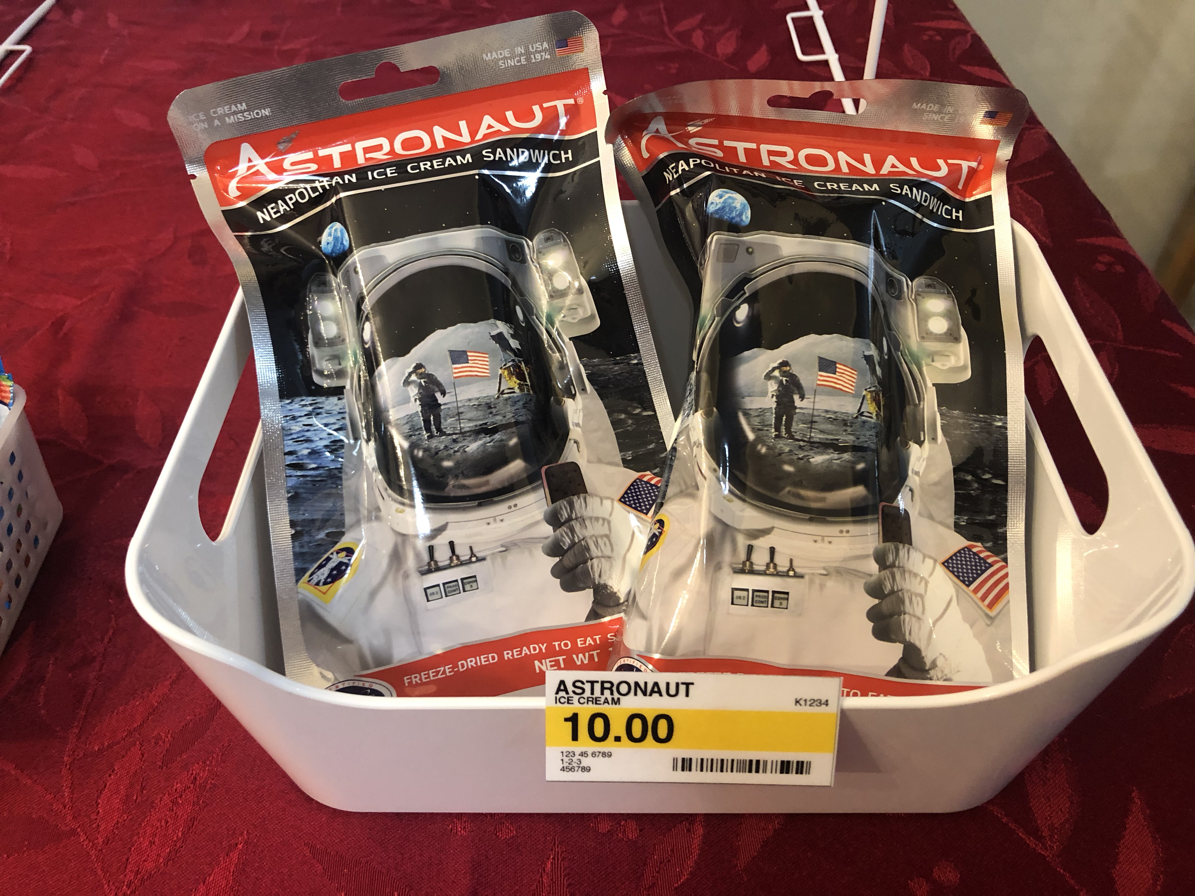 It’s simple: the kids get paid for doing various chores and worksheets. The cost? Almost nothing because everything on the shelves are either Christmas/Birthday gifts we hid or items from our pantry. I did splurge and buy the astronaut ice cream.