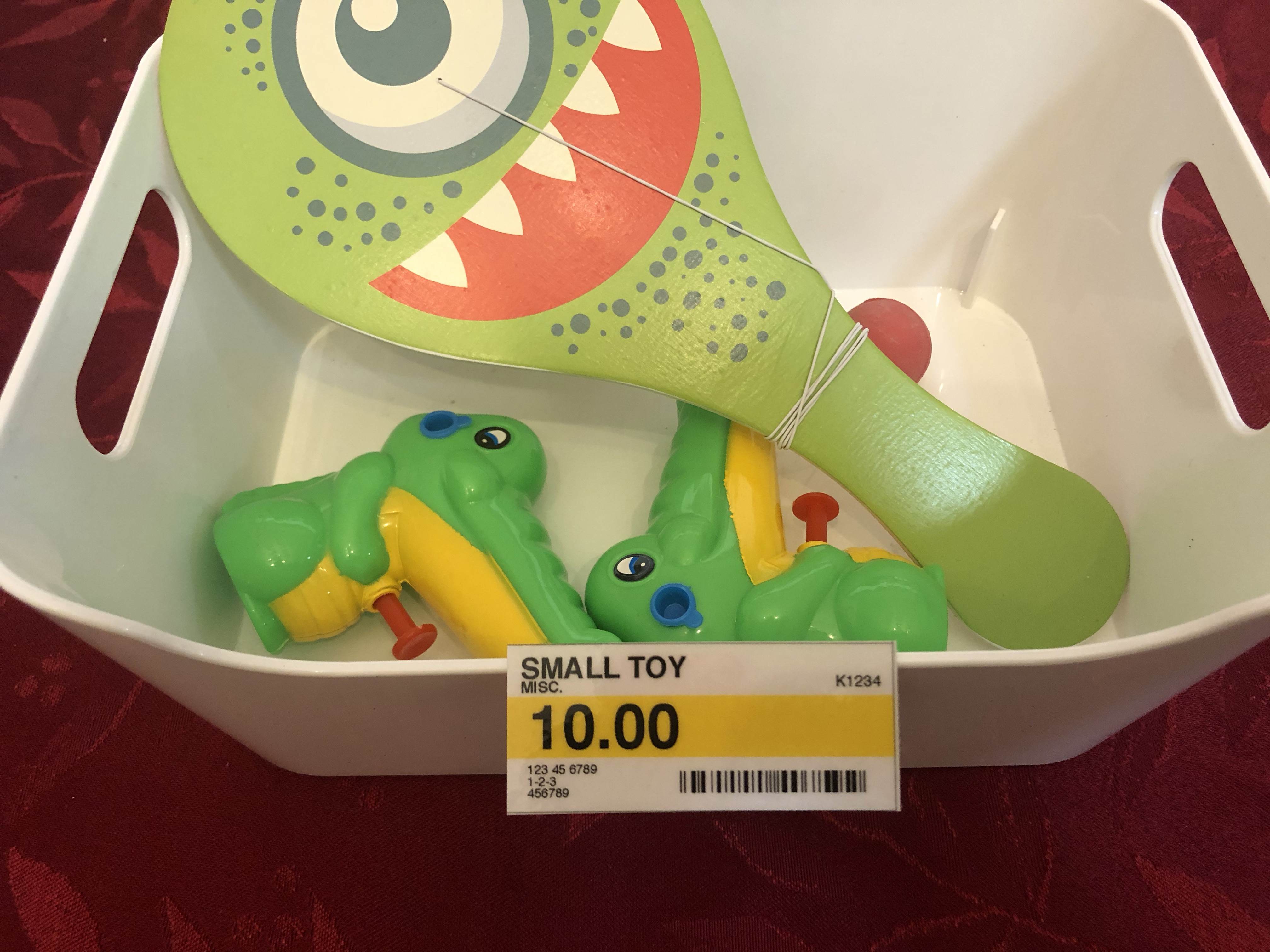 I designed some price tags to look just like the ones at Target, but using made up numbers and product descriptions. Not like the kids really care, but I do. It must be authentic!