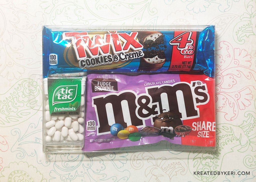I was able to fit the 4-to-go Twix bar (fit perfectly!), regular Tic-Tacs, and the share-size Fudge Brownie M&Ms. A word about those new brownie M&Ms—THEY ARE THE BEST!